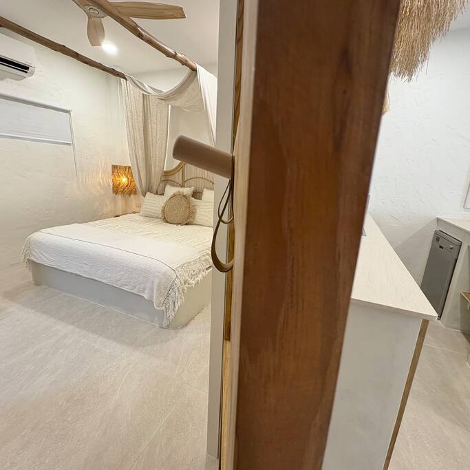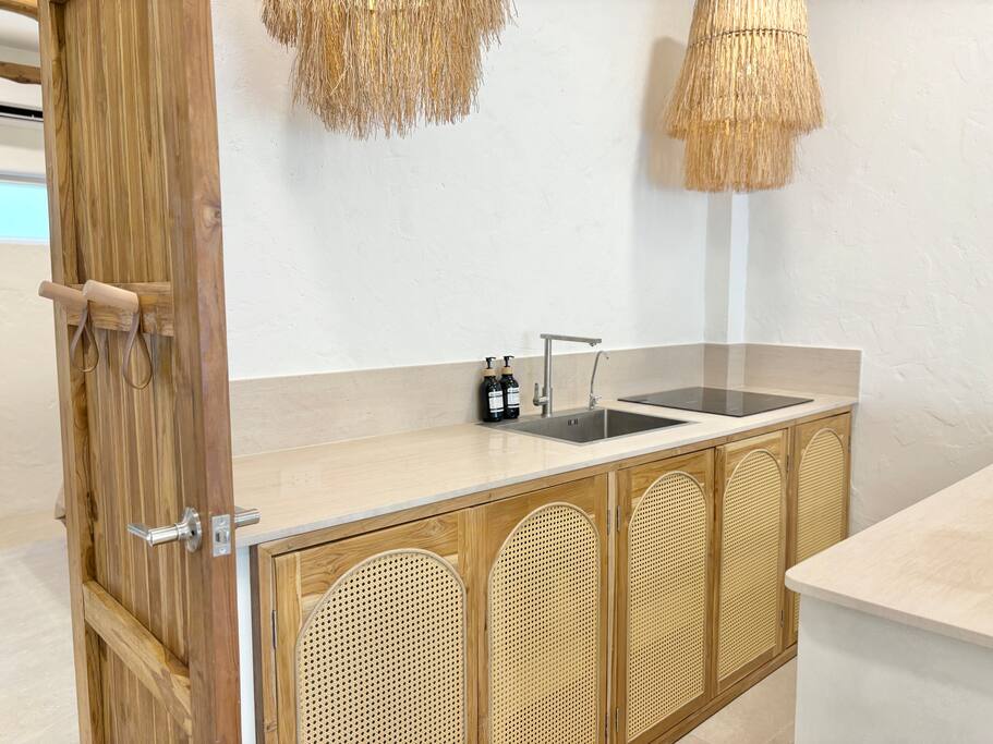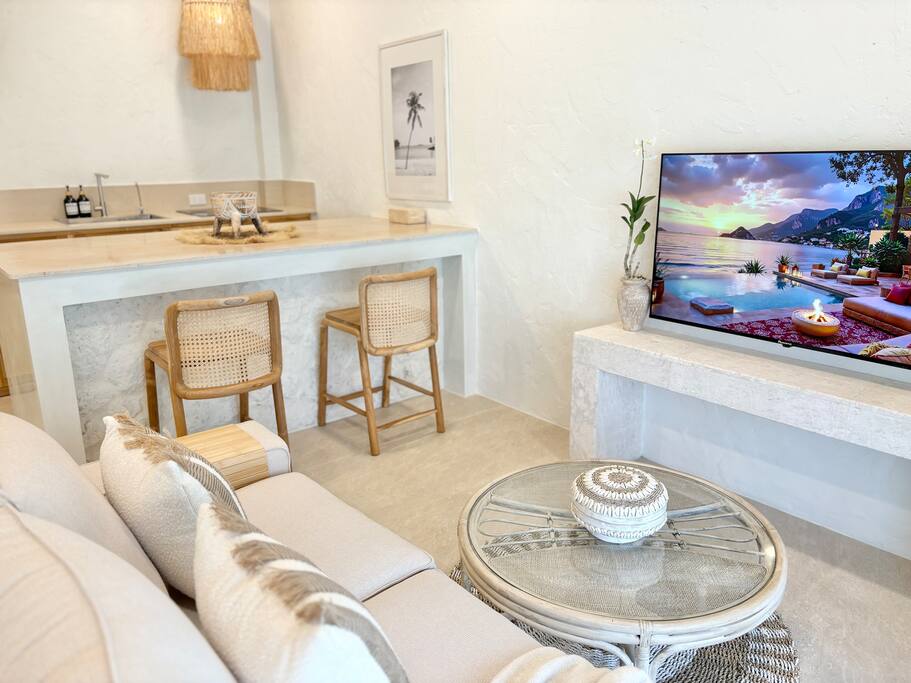 The studio apartment is a beautifully newly built Villa offering a comfortable modern bedroom with an en-suite bathroom. The apartment has air conditioning throughout. Shampoo, conditioner and towels are all included in your stay. There is a walk in wardrobe and a laundry room attached to the bedroom. The living area comes fully equipped with a 55 inch flat screen smart TV, Netflix and Youtube are available. The Villa has high-speed 5G fiberoptic internet making it ideally suited to mobile workers or people who need to work remotely while on holiday. The western style kitchen features a large fridge & freezer, 4 burner hob, dishwasher, oven, microwave, kettle, coffee maker, and full cooking and dining utensils. The outdoor area provides comfortable seating and parking – you won’t fail to enjoy the lovely peaceful setting that this property has to offer. The entire property is furnished to the highest quality for maximum comfort throughout. Smoking is not permitted inside the house. Guests are only allowed to smoke outside on the patio.